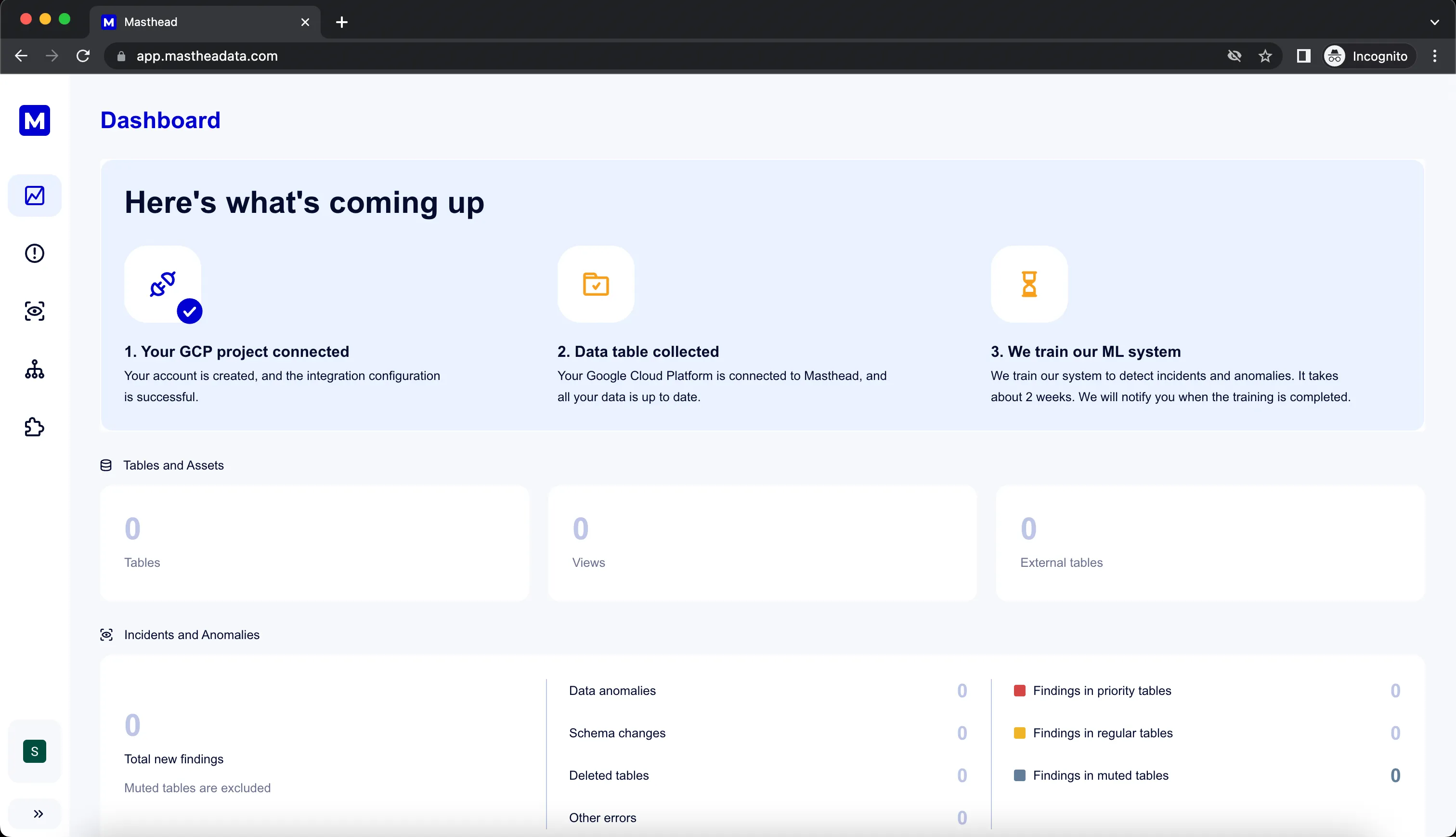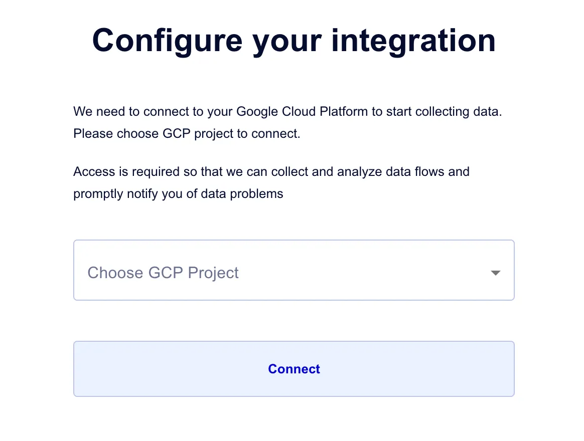 Select Google Cloud project with BigQuery resources and pipelines that need to be monitored by Masthead. Press Connect.